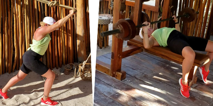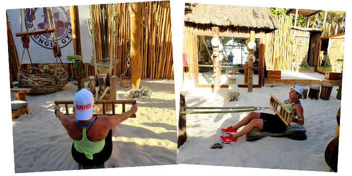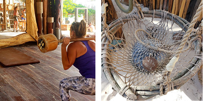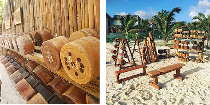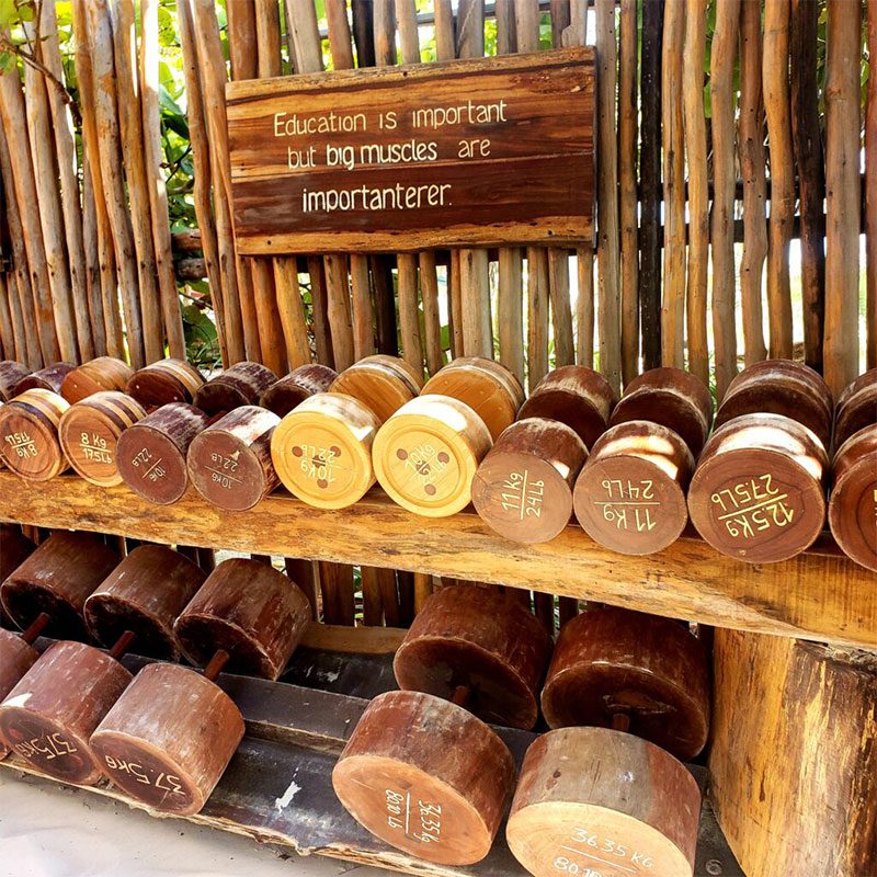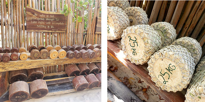 Every aspect of this neanderthal-age gym is thoughtfully and creatively designed. Rocks and stones are its weight room tools. Dumbbells are made of large pieces of wood. Ropes are the pulleys with net baskets holding rocks as its added weight. Wooden benches sit in the sand. Large mirrors framed in beautiful wood casings line one wall. The ocean breeze is constant in the gym’s open air concept. A thatch roof and bamboo sticks encase the joint, yet somehow no one feels hemmed in at all.